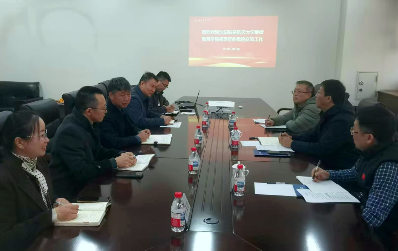 2025年10月28日,沈阳航空航天大学继续教育学院院长刘洋、成教部主任臧贺和培训部主任凤帅到大连交通大学继续教育学院走访调研。大连交通大学继续教育学院院长张剑平、副院长叶安发对我院一行三人的来访表示了欢迎,双方就学历教育、非学历培训项目办学进行了座谈交流。